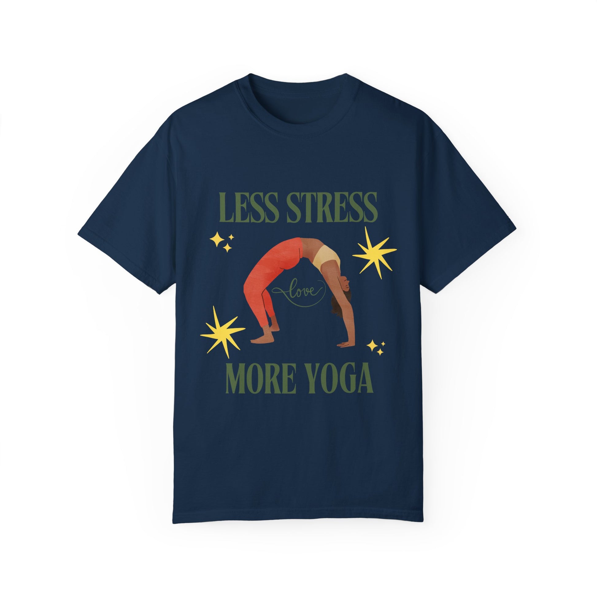 Stay calm and centered in our Unisex Yoga T-shirt featuring the inspirational quote 'Less Stress More Yoga'. Perfect for yoga enthusiasts looking for comfort and style in their practice. Ideal for yoga classes, meditation sessions, or casual wear. Great gift for yogis for birthdays, holidays, or as a self-care treat.